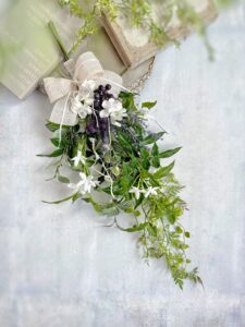 全く初めての方には、お好きなお花を挿すだけでどなたでも可愛く仕上がるアレンジ、またはスワッグをお勧めしています