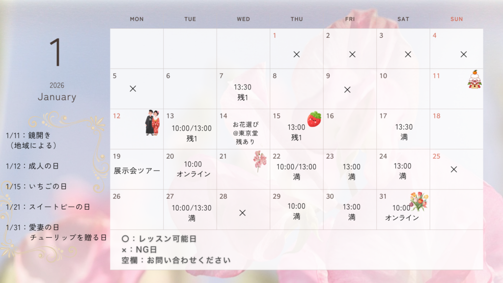 ・購入した花材はご自由にご自身の作品に使われたり(写真添削付き)、