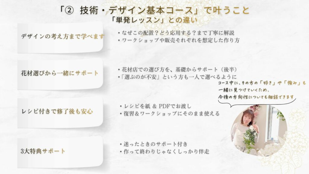 「お花の基礎」をしっかり固め、一生モノの資格と技術を身につけたい方向けです。