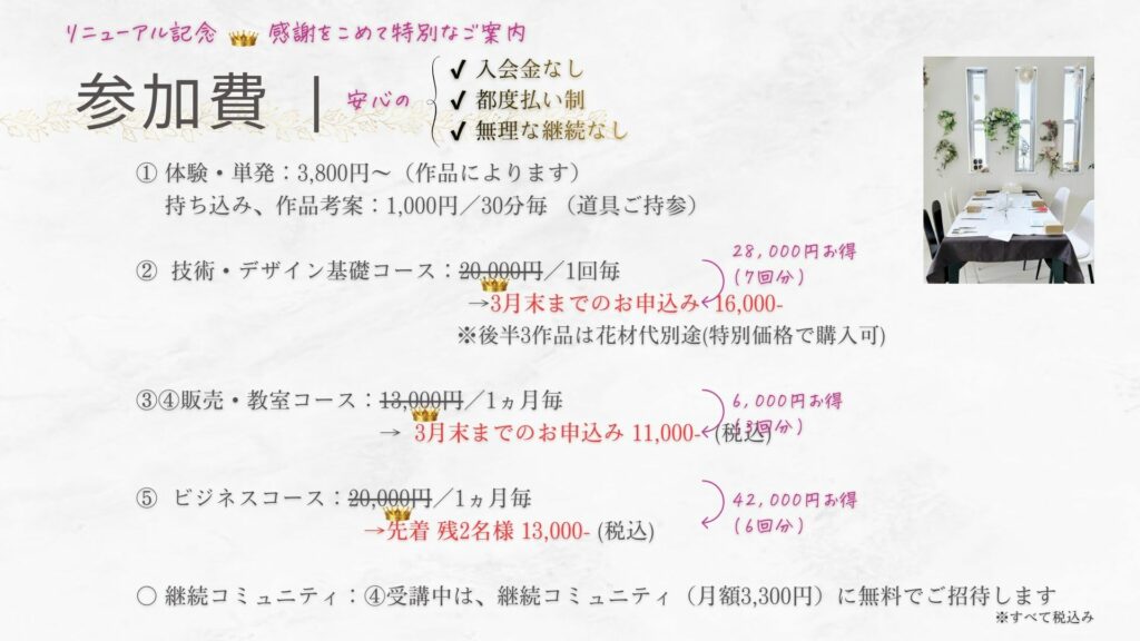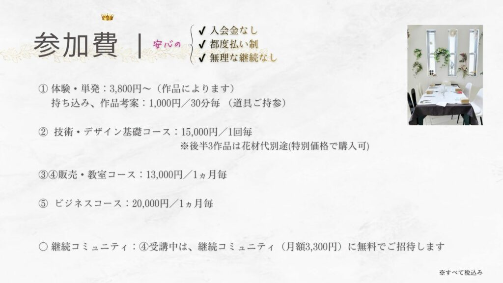 「自分らしさ」を軸に、自分でお花選びから制作までできるようになりたい方、販売や教室を現実的に動かしていきたい方向けです。